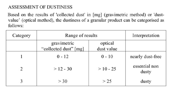 针对颗粒产品的粉尘评估,国际标准 CIPAC MT 171.1 明确了基于光X测定的”粉尘值(Dust Value)”等级划分: