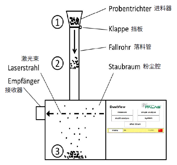 样品(通常为 30 g 散料)被倒入样品漏斗中。测量开始时,挡板自动打开,样品落入粉尘腔。挡板开启后,测量立即开始。