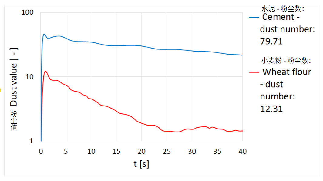 由于水泥样品具有更细的粒径分布及特定的物料特性,其产生的粉尘明显多于小麦粉样品。小麦粉中含有大量较大的颗粒,这些颗粒会迅速沉降到粉尘腔底部。相比之下,即使在30秒后,几乎所有更细的水泥颗粒仍悬浮于空气中。